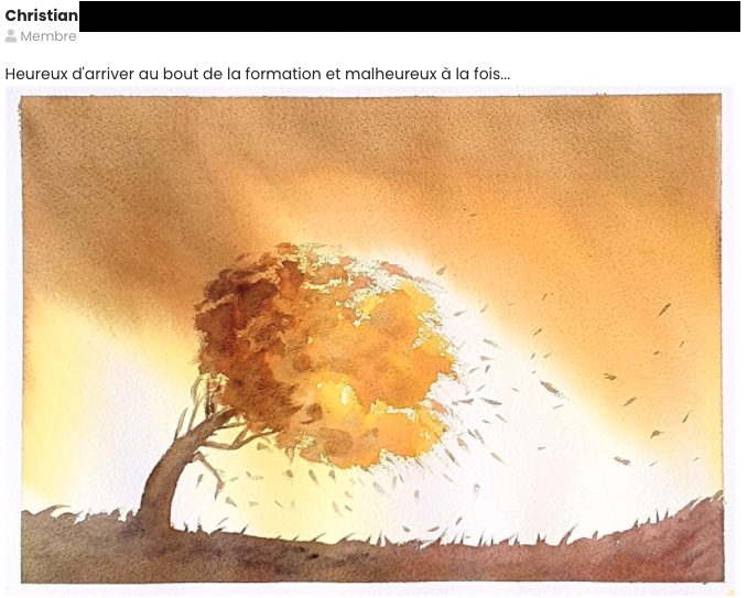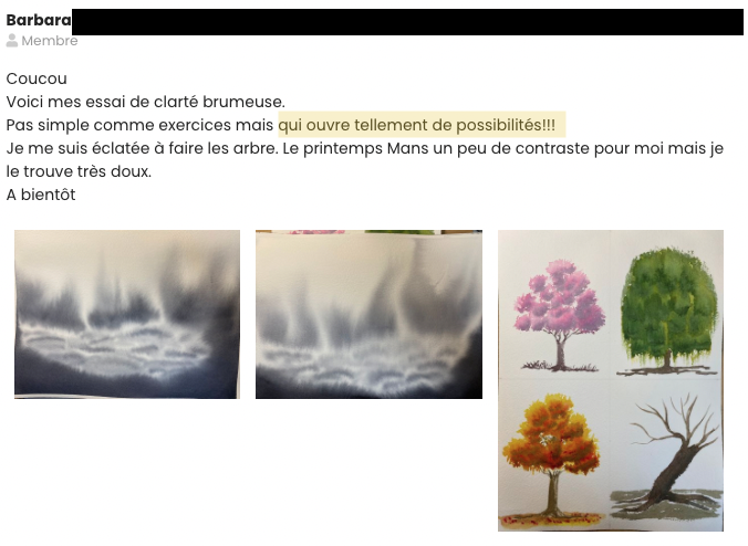 Échanger avec des personnes qui ont les mêmes valeurs et qui partagent la même appétence pour l’aquarelle peut faire la différence entre le découragement et le regain de motivation. Je vous laisse découvrir l’exemple de Dany ci-dessous: