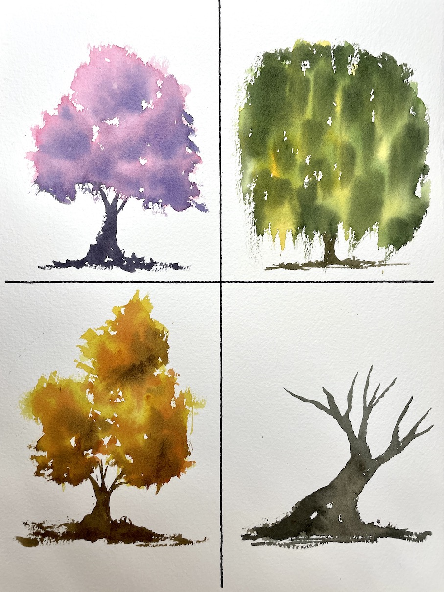 Un programme qui suit un fil directeur qui donne du sens à tous les choix techniques que nous pouvons faire à l’aquarelle: dosage eau/pigments, choix des couleurs, peinture dans l’humide et j’en passe.