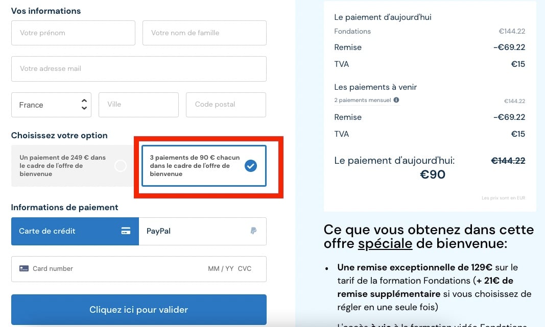 Sur la page de commande, il est possible de payer Fondations en 3 règlements de 90€ chacun.